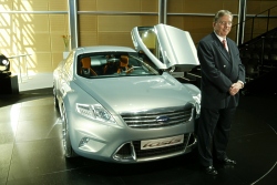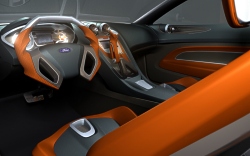 With 'kinetic design', the Ford of Europe design team has embraced the marque’s core values in an expressive, new design language. iosis expresses this language in its ultimate form. Kinetic design visualises Ford's acclaimed driving quality – it expresses energy in motion. Contributing further to these athletic, sculptural forms are the well defined wheelarch lips that have become a familiar Ford design signature since they appeared originally on the Ford Focus. Overlaid on these well defined sculptural forms are clearly recognisable graphic elements. Prominent among these is the distinctive daylight opening area with its characteristic upward tick at the rear. On iosis the new face of Ford is represented by the familiar Ford graphic of an inverted trapezoid air intake, in this case placed below a bold, chromed grille. Strongly drawn lamp graphics at front and rear are further identifiable elements with the headlamps also echoing the upward tick seen in the DLO. The precise detailing of the rear lamps and the chamfered lower corners of the rear glass combine to form another clearly identifiable graphic that defines the rear of the car. This complex surfacing and careful attention to graphic forms contributes to the tense, muscular stance of iosis. This is enhanced by precise detailing that is evident in the jewel-like featuring in the lamps and the wide, strong rocker panels. Exciting, new wheel designs with design cues drawn from the graphic elements seen elsewhere on the car are a final, vital element of the overall 'kinetic design' story. On 'iosis' this feature is expressed in a typically strong way with 20-inch wheels, milled from solid aluminium billets, featuring a contrasting polished and anodised finish that accentuates their three dimensional design. The strong sculptural forms, clearly recognisable graphic elements and fine detailing that are defined so strongly on iosis will be applied in varying ways on all future Ford of Europe models. This 'kinetic design' provides the clearly identifiable form language that will enable Ford to drive towards design leadership. Dramatic inside The interior design of iosis follows the dramatic themes of the exterior, while retaining an inviting ambience. The unique angled pivoting door arrangement gives complete, uninterrupted access to the interior, and ensures there is an instant visual link between the interior and exterior. All the sections from the instrument panel through to the centre stack and through to the console reflect the dramatic forms of the exterior. The instrument panel itself is a slim and complex form that sweeps around the front occupants of the vehicle. These forms are complemented by a selection of trim materials and colours that interprets the dynamic sporty exterior in a particularly modern way. By combining futuristic materials such as rubber and aluminium with luxurious materials, like leather, an ambience has been created that matches a technical character with sophistication. An ultra modern steering wheel fashioned from solid aluminium with contrasting orange glove leather grips and a graphite metallic leather airbag pad is matched by the Focus World Rally Car inspired sequential gear shifter. Together they embody all the themes running through the interior: contemporary craftsmanship, high quality materials and a touch of surprise-and-delight technology, with the starter button mounted beneath a flip lid on top of the shifter. The driver's cockpit is dominated by a prominent instrument binnacle housing a cluster of analogue instruments. Their chronograph precision is balanced by a high definition LCD display, reconfigurable for the navigation system or views from three rearward facing cameras. Eye-catching seats with skeletal frames featuring a ribcage and vertebrae structure are fashioned from aluminium and formed rubber. Separating the front seats is a 'flying bridge' centre console. The air vents featured on the facia and the centre console have a twist control that unfurls the vanes in a way that mimics those of a jet fighter’s afterburners. This imagery of a jet’s thrust is highlighted in the doors by aluminium inserts which flow and taper away from the vents. Neoprene is used extensively in the interior finishing in three colours: dark charcoal, "oxygen" - a metallic grey - and a strong shade of technical orange. There is also a unique leather finish that has a subtle, graphite metallic look. For the floor, conventional carpeting has been replaced with a more rugged, structured weave with technical silver highlights. Innovation iosis features a number of design innovations. The dramatic angled pivoting door arrangement features doors constructed from carbon fibre for lightness. The doors are powered by rams that swing them upwards and outwards via a system of sophisticated hinges that ensure additional support isn’t required when the doors are open. There are no conventional door mirrors on iosis. Mounted in the rear valance is a camera to complement those on each door . The exterior cameras are pieces of precisely machined aluminium, swept back to further underline the car’s visual appearance. The front lamps have an inner circular turning led for low beam with a vertical day time running light, separating it from the turn signal on the outer edge. Beneath these lighting elements are ten main beam leds, emerging when lit from tubes like a series of lasers. This look is echoed in the rear light cluster with tail lights organised in a circle with a flattened top, flanked to the outside by the indicators and inboard by the stop lights. Inside iosis, the centre stack houses docking points for a pair of memory sticks. It is possible that rather than using a conventional key or even keyless entry, a memory stick could be used that as well as acting as a security device, would also contain the driver’s personal preferences for driving position, audio settings, screen configuration, etc. Another s