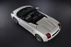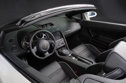 The rear screen moves automatically while the roof is being opened or closed. This automatically-controlled movement always returns the screen to the raised position. The driver can also choose to have the screen in the lowered position (also with the roof raised) by pressing the appropriate button on the dashboard. There is also a "service function" that positions the roof so as to allow access to the engine. Great care has been taken over the structural design of the new Gallardo Spyder, which of course complies fully with all the relevant safety standards. The space frame has been reinforced in the area of the sills and the A pillars have been strengthened with the adoption of an automatic Roll Over protection system (comprising two “pop-ups") integrated with the air bag system. All these solutions, which place Lamborghini at the very forefront of open top car design, were driven by the need to present to the public a true spyder characterised by a pure design. Engine and Performance The new Lamborghini Gallardo Spyder features a number of important modifications to the original engine and transmission from the Coupé. The 10-cylinder 4961 cc propulsion unit now develops 520 hp (382 kW) at 8,000 rpm. The six-speed gearbox now has lower ratios (1st gear is 27% lower, 2nd gear is 13%, 3rd / 4th / 5th gears are all 6% lower, while 6th gear is 3.5% lower), which create a more dynamic performance. The steering is also more direct and precise and the suspension has been recalibrated. Like the other models in the range, the Gallardo Spyder also benefits from aluminium bodywork and features permanent four-wheel drive. And finally, its performance figures: the Gallardo Spyder – which complies with EURO 4 homologation standards – reaches a top speed of 314 km/h with the roof up and 307 km/h with the roof down, accelerating from 0 to 100 km/h in 4.3 seconds. Equipment Amongst its standard equipment the following items are particularly worthy of mention: power steering fluid cooler (for sports use) automatic door locking at speeds of over 15 km/h Lamborghini Multimedia System as standard (not available for Japan) There are also new body