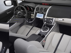 DISTINCTIVE AND SOPHISTICATED EXTERIOR Chief Designer Iwao Koizumi, whose previous works include the successful MAZDA 6 and the 1995 RX-01 showcar, names the design theme, "advanced frontier"CX-7 takes Mazda and its Zoom-Zoom image into an area it has never before ventured. Notes Koizumi, "My idea for the CX-7 design was to combine dynamic movement, speedy shapes, and a bold presence in one passionate statement. Mazda has the sports car heritage to offer a crossover SUV with a strong and distinctive appearance." SPORTY AND HIGH QUALITY INTERIOR An advanced and sporty image was pursued in designing the interior. The instrument panel consists of a unique ‘double-roof' structure, in which a small ‘roof' over the meter cluster is positioned just in front of a large ‘roof' that extends across the entire instrument panel bringing together the driver and front passenger. To draw drivers inside, there's a three-dial instrument cluster, a console supporting the shifter within close reach, three-spoke steering wheel and firmly contoured front bucket seats, all provided with a high quality feel . Koizumi emphasizes that detailed attention is given to the entire interior, including the cargo area. For the two-tone trim, the side surface two-tone graphic reaching from the front doors all the way to the cargo space stylishly harmonizes with the kicked-up beltline of the exterior side view. ZOOM-ZOOM WITH ROOM Using the innovative MX-Crossport concept shown at the 2005 Detroit Auto Show for inspiration, the chief designer mapped out the CX-7 with ample space for five occupants.The rear seat not only carries three passengers in comfort, it also splits and folds 60:40 to increase cargo capacity and versatility . BALANCE OF AMPLE POWER AND ENVIRONMENTAL PERFORMANCE - MZR 2.3L DISI TURBO ENGINE - The heart of every Mazda is its spirited powertrain. Under the hood of the CX-7 is a version of the turbocharged and intercooled 2.3-liter four-cylinder direct-injection gasoline engine that powers the highly regarded MAZDASPEED 6 sport sedan. Engineered to deliver high performance at all speeds, along with low exhaust emissions and excellent fuel economy, Mazda's MZR 2.3 DISI (Direct Injection Spark Ignition) turbo -charged engine produce s an enthusiastic 244 horsepower at 5, 000 rpm in the CX-7. DETERMINED DRIVE Advanced transmission and drive components pass the engine's power cleanly to the pavement. The six-speed Sport AT automatic transmission provides the full manual control demanded by assertive drivers. Shifts are crisp, in keeping with CX-7's sportscar character. Two drivelines are offered: Front-Wheel Drive or Mazda's Active Torque-Split A ll- W heel D rive . The latter system uses a computer-controlled coupling integrated with the rear differential to deliver up to half the available torque to the rear wheels on demand. Sensors monitor engine information, individual wheel speeds, A nti-lock Brake System ( ABS ) operation, and the CX-7's standard Dynamic Stability Control (DSC ) system to optimize torque distribution. Whether the driving conditions are dry and fast or slippery and moderately paced, exceptional handling is assured. CRAFTY CHASSIS WITH MAZDA SPORTSCAR DNA A light, stiff unibody provides the sound foundation for CX-7's smooth ride and agile handling. Computer- A ided- E ngineering analysis was used to optimize this structure, delivering high torsional and bending rigidity with minimal weight. BUILT-IN-SAFETY CX-7's rigid unibody uses the Mazda Advanced Impact energy Distribution and Absorption System to realize high levels of collision safety and helps to protect occupants i n various accident situations, including front, side and rear impacts . The body's frame sections are large in size and as straight as possible, high-strength steel is used where it's effective, and subframe connections help absorb collision energy. Stamping the side frame from a single tailored blank minimizes center pillar deformation during a side impact. ENTERTAINING FEATURES To delight, the Mazda CX-7 offers a wealth of entertainment gear. The CX-7 offers AM, FM, and CD play capability as standard . Sirius satellite radio is available as an option. To further support driving pleasure and convenience, a touch-screen D VD -based n avigation system with voice commands and a rear-view camera system are available to select as an option . In addition, buyers may choose a BOSE ® premium sound system package that includes n ine speakers, approximately 240 watts of amplification, a six-CD changer and CENTERPOINT ® surround-sound system that offers five-channel digital imaging, to create a true premium audio entertainment. THREE EDITIONS – VARIATION FOR CUSTOMERS CX-7 is offered in three trim levels. Some of the highlights of the s tandard features are manual air conditioning, power windows, power door locks, retractable key, cruise control, and six air bags. Also standard on all CX-7s is an A nti-lock Brake System (ABS), Dynamic Stability Control (DSC) and a Traction Control System (TCS). The Touring edition adds leather trim (seats, steering wheel, shift knob), power adjustment of the driver's seat, heated front seats, and a retractable cargo cover. In top-line Grand Touring trim, CX-7 is equipped with features such as leather with a black sport seat stripe, high intensity discharge ( HID ) headlamps, fog lamps, body-color mirrors, chrome door handles and automatic interior climate control. Mazda's CX-7 arrives in the North American market in the spring of 2006 as a 2007 model. (4 January 2006)
