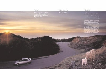 Photo: Toyota New York, NY - Toyota announced the launch of a new corporate advertising campaign entitled "Today Tomorrow Toyota." The campaign focuses on the vision and innovative thinking of Toyota and will run in over 50 national publications, ranging from Newsweek to Environmental Design and Construction. "This campaign has evolved from the one running since 1997. It continues the theme of Toyota as a good global neighbor, but goes beyond the facts of our presence in America," said Marjorie Schussel, manager of corporate communications for Toyota Motor North America. "This new campaign presents Toyota’s vision as a company, and how the projects we are investing in today will have a greater positive impact in the future." The advertisements contain three columns of text, one each under the "Today Tomorrow Toyota" banner. The first ad, focusing on Toyota’s intelligent highway systems, reads, "Today... Develop smart highway systems to help traffic move more smoothly. Tomorrow... Think up new excuses for being late to work." The second ad reads, "Today... Mass-produce a hybrid system that reduces smog-forming emissions by up to 90%. Tomorrow... The other 10%." In both ads, the "Toyota" column provides details on the highlighted program. The campaign was created by Oasis Advertising, New York. "Toyota and Oasis have spent the last 18 months speaking with consumers and analyzing their attitudes toward corporations," said Paul Bernasconi, partner/creative director at Oasis. "We learned that consumers are genuinely interested in more than information about the product or corporate facts. They want to get an understanding about the spirit and philosophy of the corporation behind the product. "Toyota has always been known for making quality products, but people don’t know as much about Toyota’s visionary spirit and that the company is working on projects that will have a positive impact on everyday life," added Bernasconi. In addition to well-known titles such as Business Week, Newsweek, and National Geographic, the advertising is scheduled to run in non-traditional vehicles for corporate advertising. These vertically targeted magazines and trade journals have audiences with a strong affinity for environmental and technological topics, including Architecture, Environmental Design and Construction, and American Scientist. "At a time when new media is a hot topic, we’ve found an innovative way to utilize a very traditional medium -- print -- to reach this audience," added Schussel. "Toyota has worked with the creative team at Oasis for over 12 years, and they continue to deliver high quality advertising that captures the many facets of Toyota as a corporation." (April 16, 2001) [Homepage] [