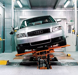 Photo: Audi Ingolstadt - The motto "Vorsprung durch Technik" applies not just to the cars manufactured by Audi, but also to their production. One example is the assembly of the new Audi A4 in Ingolstadt. Audi has invested around DM 130 million in a new assembly shop with the most modern production processes. Among the numerous innovations in A4 assembly are the fully automatic refueling system, the truck lift for logistics handling and the combined shaker and ESP test rig - a world first in car production. A first because up to now only separate test rig systems have been employed in the automotive sector. The equipment used for the new A4 combines both technologies together in one test rig for the first time. Once its assembly is completed, every Audi A4 must pass through this stationary "torture chamber". It is jarred, rattled and shaken, without moving even a metre from its starting point. AUDI AG has filed for patents on the combined test system. The concept was put into practice by Siemens. The Electronic Stability Program (ESP) is standard on all Audi models. Contrary to the practice of other car manufacturers, Audi subjects every completed vehicle to an ESP test on a test rig at the end of the production line. Karl Unger, Head of Production Planning - Superstructure/Structure Planning - Assembly at Audi, explains the advantages of active ESP testing: "During the test, transverse-acceleration, longitudinal-acceleration, and yaw-rate sensors are checked by moving a vehicle about its transverse, longitudinal, and yaw axes. The complete test is fully automatic. For one minute the rig runs fixed profiles, and for one minute it runs free. The parameters of the test programme run through a universal proving system (UPS) with communication to the control unit. We achieve reproducible test results with it, and so replace a "double-S" run on the test track that would otherwise be necessary." This saves a great deal of time. And, as Karl Unger adds: "For logistical reasons, it would hardly be possible at the moment to take every new A4 from production to the test track on the company's site and have the double-S run carried out there." After all, around 1,300 new A4 models come off the Ingolstadt assembly lines every day. The computer-monitored vibration test incorporates three tracks with three different surfaces. An A4 fresh from the production line is subjected to a rough-track test over cobblestones, bumps and through potholes. During this time, customer-relevant creaks and rattles are assessed which may occur, for example, in the region of the glove box, centre console or instrument panel. Since the vibration test takes place before suspension tuning, the shaking encourages the early settling of body and suspension. The result: a better long-term suspension setup in the subsequent operation. This is just one example of the numerous innovations that have been incorporated into A4 assembly. Another innovation at Ingolstadt are the two fully automatic refueling systems. The operator only has to open the filling cap by hand; all other operations are taken over by his colleague, the "robot filling-station attendant". First an operator had to carry out a complete filling operation by hand. A mobile data carrier, which can be found on every vehicle, sends the relevant information such as filling quantity, filling speed and fuel grade to the 7-axis robot. The latter detects the filler neck with the aid of a 3D camera system. And how does that work? Two cameras take pictures of the filler neck from different angles, and this information is used to determine its position. The process is based on the stereo-image principle of the human eye. The computer calculates the displacement of the filler neck from a pre-programmed standard point, moves the filling nozzle into position and starts refueling. The advantage of the 3D camera technique is that different types of vehicle, in this case the A4 saloon and A4 Avant, can be recognised and filled using a single refueling system. The filling process takes on average one minute. The new car is filled with between five and twenty litres of diesel, petrol or different reference fuels depending how far it has to be driven. After the refueling process the robot uncouples and returns to its start position. Finally the filling parameters are recorded on the data carrier in the vehicle. The movements of the robot are synchronised with the production line conveyor throughout the refueling process. (August 21, 2001) [Homepage] [
