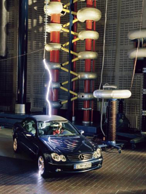Lightning impulses of up to 1.4 million volts During the series of laboratory tests carried out at Berlin's Institute for High Voltage and Power Engineering, scientists discharged several dozen lightning impulses across the CLK Cabriolet using powerful capacitors connected in series. Lightning impulses of up to 1.4 million volts were achieved during the course of these tests. Measurement of the electrical field strength inside the closed CLK Cabriolet confirmed the protective effect of the soft-top structure acting as a Faraday Cage: the lightning current was guided harmlessly to ground via the soft-top frame assembly, the car body and the tyres. Thanks to reliable shielding, the electronic systems on board the CLK Cabriolet also proved immune to the powerful electromagnetic field generated by the lightning current in each of the tests. In the past year, there were some 2.9 million cases of lightning discharge during storms over Germany, Austria and Switzerland, compared to around 2.2 million cases in 2001. The highest lightning incidences were recorded in the months of June, July and August. With over 190,000 incidences, June 20 was Germany's most prolific day for lightning in the year 2002. Lightning is discharged around one million times per hour above the Earth's surface. (April 22, 2003)