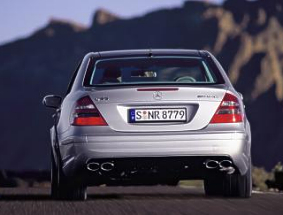 The exceptional status of this new AMG high-performance estate is immediately obvious when one looks under the bonnet or opens the tailgate. Thanks to turbocharging the eight-cylinder AMG engine develops an output of 350 kW/476 hp at 6100 rpm from a displacement of 5.5 litres, as well as an outstanding torque of 700 Newton metres at between 2650 and 4500 rpm. Depending on the position of the rear seats the load capacity varies between 690 and 1950 litres (VDA measuring method). No other series-production estate boasts as much output and torque or offers such a large, flexible interior as the new E 55 AMG Estate. 34 percent more output and 32 percent more torque The new E 55 AMG Estate develops 34 percent more output and 32 percent more torque than its predecessor with a naturally aspirated V8 engine (260 kW/354 hp and 530 Newton metres). Its performance figures need fear no comparison with sports cars: the Estate accelerates from standstill to 100 km/h in just 4.8 seconds (predecessor: 5.9 sec), while the maximum speed is limited to 250 km/h. Dynamic driving enjoyment and the greatest possible comfort are guaranteed by the five-speed automatic transmission with AMG SPEEDSHIFT, steering wheel gearshifting and a manual driving programme. More rapid gear changes, active downshifting when braking, and torque converter lockup after first gear provide extremely agile handling. Unique high-tech innovations for the braking system and suspension Technological exclusivity is the order of the day for the braking system and suspension of the E 55 AMG Estate. Large, internally ventilated and perforated brake discs ensure outstanding deceleration figures and fade-resistance. In conjunction with the electrohydraulic braking system Sensotronic Brake Control (SBC™) this makes for optimal driving safety. The AMG sports suspension AIRMATIC DC, with an adaptive damping system (ADS II), features new spring struts with a reduced air volume and thicker stabilisers. The springs and dampers instantly adapt themselves to the style of driving at any given moment by microprocessor control, and the driver is able to select the required configuration in three stages from comfort-oriented to sporty/stiff at the touch of a button. Whatever the load carried, the rear axle with its standard level control system guarantees an identical spring travel at all times - providing the ideal conditions for maximum ride comfort. Characteristic AMG bodystyling and an AMG sports exhaust system