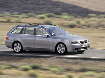 Photos: BMW Get in and feel at home: The 5 Series Touring offers high-class materials in five equipment versions and with four interior colour worlds ensuring supreme comfort and refinement on the road. Two examples are the new, extra-quiet automatic air conditioning with adaptive air humidity control and the multifunctional comfort seats available as an option. And never before has the interior of a 5 Series Touring been as bright and 'breezy' as on the new model available as an option with a two-piece glass panorama roof measuring 0.68 square metres in size to give the car's passengers both front and rear a wonderful view and, when fully open, almost the feeling of driving in a convertible. Compared with the former model, the new BMW 5 Series Touring has grown significantly in virtually every respect: Length is up by 38 millimetres (1.50´´), width has been increased by 46 millimetres (1.81´´), and the new Touring is 23 millimetres (0.91´´) higher than before. In all, therefore, the new Touring measures an impressive 4.48 metres (190.55´´) in length, 1.85 metres (72.83´´) in width, and 1.49 metres (58.66´´) in height. Looking at the car from outside, however, you will hardly notice this growth in size and dimensions, short overhangs front and rear, extra-large wheels, and a wide track giving the new 5 Series both an elegant and dynamic appearance. But inside the new 5 Series Touring is another story, with up to 3 centimetres or 1.18´´ more shoulder room for the passengers, greater headroom, and 4.5 centimetres or 1.77´´ more kneeroom for the passengers at the rear. Despite this increase in dimensions both within and outside the car, and even with the wider range of passive safety features, the weight of the new Touring has not increased over the former model. On the contrary: Thanks to an innovative combination of aluminium and steel in the bodyshell - as on the Saloon - weight has even decreased, depending on the model and the level of equipment, by up to 50 kilos or 110 lb. Luggage compartment: larger, more variable, and with even better access Nobody has to get their hands wet or even dirty when opening and closing the tailgate on the new BMW 5 Series Touring. For as an option all you have to do is press a button on the key to the car and the tailgate will open and close fully automatically. At the same time, with the rear lid swinging up or when opening the rear window, the roll cover automatically moves to the front for convenient loading and unloading without requiring any additional intervention on the part of the driver or passengers. And to conveniently put in or take out small items of luggage, the luggage compartment, like on all BMW Tourings, is also accessible through the separately opening rear window. The floor of the luggage compartment is completely flat from front to rear, from one side to the other. Loading capacity ranges from 500 (535) litres (17.5/18.7 cu ft) all the way to 1,615 (1,650) litres (56.5/65.0 cu ft) with the rear seat bench tilted forward and the compartment fully loaded up to roof level. This is 90 (125) litres (3.5/4.9 cu ft) more than on the former model (figures in brackets applicable to models featuring runflat tyres and therefore not requiring a spare wheel). Taking along the family, the driver of the new 5 Series Touring is able to easily accommodate two large as well as two medium-sized hard-shell suitcases and two travel bags in his car. And as an alternative, four 46-inch golf bags also fit conveniently into the luggage compartment. Lockable for extra security, the floor of the luggage compartment can be raised up from its usual position, then remaining at any setting desired with the help of gas pressure springs (like the engine compartment lid), before being lowered once again. Beneath the floor panel the driver will then find a variable storage compartment for small odds and ends. The spare wheel, finally, comes one level further down (or, as an alternative, an additional 35-litre/1.2-cu ft luggage box whenever the 5 Series Touring is equipped as an option with runflat tyres). The luggage compartment comes as standard with a roll cover, a partition net, four lashing points and a power socket, for example for connecting an electric cooling box. Optional extras include an additional storage package with a two-piece floor panel, folding partitions preventing, say, carrier bags from falling over, lashing belts in the side panels and multifunction holders serving, for example, to accommodate your shopping bags. Split 60:40, the rear seat bench may be combined as an option with through-loading including a ski-bag. Another option is the roof railing for conveniently fastening a roof box or roof rack system carrying a roof load of up to 100 kilos or 220 lb. Entering the market in four model variants The new BMW 5 Series Touring is entering the market in the guise of the 525i and 540i, the 525d and 530d. With the exception of the refined 2.5-litre straight-six bi-VANOS petrol engine in the 525i carried over from the former model, the other three engine variants are new to the 5 Series Touring, offering a significant increase in output, torque, and performance. The 520i and 530i will be following in spring 2005. Featuring a VN turbocharger and the latest common rail fuel injection, the brand-new 2.5-litre straight-six diesel develops maximum output of 130 kW (177 bhp) from 2,497 cc and muscular torque of 400 Newton-meters or 295 lb-ft between 2,000 and 2,750 rpm. This is an increase in output by 10 kW/14 bhp and in torque by 50 Nm/37 lb-ft over the former model. Acceleration to 100 km/h in the 525d comes in 8.3 (8.5)* seconds, fuel consumption in the EU cycle is a mere 7.0 (8.0) litres on 100 kilometres, equal to 40.4/35.3 mpg Imp. Top speed, finally, is 225 (222) km/h or 140 (138) mph. Starring as a genuine power diesel, the three-litre six-cylinder develops maximum output of 160 kW (218 bhp) and supreme torque of 500 Nm (369 lb-ft)