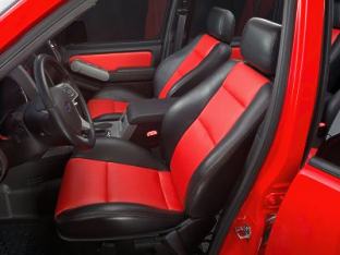 Photos: Ford Inside, four comfortable bucket seats feature supportive thigh and chest bolstering. Unique red leather seat inserts match red leather interior door trim panels, adding to the Adrenalin's sporting flair. The instrument panel houses easy-to-read, white-faced instruments, an SVT design hallmark. A navigation system is also included, a first for an SVT-badged vehicle. Power for the track, power to tow The Sport Trac Adrenalin delivers searing acceleration with its 4.6-liter, 32-valve DOHC V-8 powertrain. A Roots-type supercharger and water-to-air intercooler boost output to a whopping 390 horsepower and 390 pounds-feet of torque. Making the most of the power is a six-speed automatic transmission - the first for any SVT vehicle. The six-speed automatic has proven capable of heavy-duty use, contributing to the projected 6000-pound towing capacities of the Sport Trac Adrenalin. Adrenalin is hundreds of pounds lighter than other sport trucks built off full-size pickups. The resulting power-to-weight ratio ensures impressive acceleration under full throttle, and good fuel economy during more leisurely driving. Addressing owners' requests, the new sport utility truck expands the multi-purpose flexibility current Explorer Sport Trac owners appreciate. More interior room is provided by stretching the current Sport Trac exterior dimensions by nearly five inches in length and two inches in width. More cargo space - 30 percent more, in fact - is created by the wider bed and taller bed rails, and the addition of a pair of lockable compartments integrated into the bed. SVT-tuned independent suspension offers balanced, agile dynamics Sport Trac Adrenalin also features superior driving dynamics. With a 113-inch wheelbase, and track just over 60 inches, the Adrenalin offers a more compact footprint than competitors' sport trucks. Combined with a lighter curb weight, the Adrenalin promises to improve on the nimble, composed dynamics that made the SVT F-150 Lightning famous in enthusiast ranks. Adrenalin features short- and long-arm front suspension, and a trailing-blade independent rear suspension (IRS). SVT-tuned shock and spring rates, as well as upgraded front and rear stabilizer bars, are designed to provide more aggressive, more controlled driving dynamics. The independent rear suspension is tuned for ultimate control and driver feedback. Oversized brakes at all four corners help handle the added velocity made possible by 390 horsepower. Huge, split-five-spoke 21-inch wheels - wrapped in 295/45R21 tires - allow ample airflow to keep the big binders cool during rigorous use. Spacious seating for four, all-wheel drive and AdvanceTrac® with Roll Stability Control™ Sport Trac Adrenalin also addresses the requests of SVT Lightning enthusiasts for more seating and the option of all-wheel drive. For the best handling and power-to-weight ratio, Lightning pickups have always been regular-cab, short-bed variants of the F-150, limiting comfortable seating capacity to two people - or three in a pinch. In addition, Lightnings have solely been equipped with rear-wheel drive, making maximum acceleration a balancing act between full throttle and excessive - if entertaining - wheelspin. The Adrenalin evolves the fun-to-drive character of the Lightning, while addressing these requests. It features four full-sized doors, providing easy access to comfortable seating for four adults. The drivetrain is designed to accommodate rear-wheel-drive or all-wheel-drive configurations - another first for an SVT-engineered vehicle. Driving enthusiasts weaned on rear-wheel drive performance vehicles need not fear that all the "fun" of rear drive has been dialed out. The Sport Trac Adrenalin AWD system exhibits a 60/40-torque split biased to the rear, so as weight is transferred to the back set of wheels during takeoff, engine torque is delivered right where it's needed. In addition, the all-wheel-drive system is paired with Ford's industry-exclusive safety system, AdvanceTrac® with Roll Stability Control™. Combined, these systems provide an added measure of safety and control during slippery conditions or emergency maneuvers. As such, the Sport Trac Adrenalin offers safety and protection to match its impressive performance. (March 18, 2005)