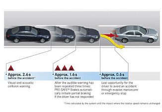 The newly developed PRE-SAFEŽ brake system improves this preventative occupant protection even further. This unique system automatically brakes the CL-Class before an impending accident and operates in tandem with the Brake Assist PLUS (BAS PLUS) system introduced last year, which warns the driver of an imminent rear-end collision with visual and audible signals and automatically calculates the required braking pressure to prevent an accident. This braking-power support is available as soon as the brake pedal is operated. The PRE-SAFEŽ brake system goes one step further: if the driver does not react to the BAS PLUS warnings, the PRE-SAFEŽ brake system triggers automatic partial braking where an accident is imminent and slows the CL-Class down at a rate of up to 0.4 g (around 4 m/s˛), corresponding to around 40 per cent of the total braking power. In addition to the visual and acoustic warning, the automatic partial braking provides the driver with another clear warning to act. If the driver then immediately applies the brakes, the maximum braking force is available and the accident can - depending on the situation - be averted at the last moment. If an accident is unavoidable, the PRE-SAFEŽ brake system reduces the impact severity and, in turn, the risk of injury to the vehicle occupants. The anticipatory PRE-SAFEŽ measures on board the new Mercedes coupé are also activated automatically when the PRE-SAFEŽ brake system goes into action. As soon as the system commences automatic partial braking, the supporting bolsters in the dynamic multi-contour seats are inflated and the front passenger seat is moved to the most favourable position. As with Brake Assist PLUS, the new PRE-SAFEŽ brake system also utilises state-of-the-art radar technology to scan the situation in front of the car and detect a potential accident. Two short-range radar sensors with a range of 30 metres and a scanning angle of 80° are located behind the front bumper fascia on the CL-Class. The additional long-range radar in the radiator grille has a range of 150 metres. Accident severity reduced by 40 per cent Mercedes-Benz has conducted extensive tests on the effectiveness of the new PRE-SAFEŽ brake system. In the DaimlerChrysler Research driving simulator in Berlin, Mercedes engineers conducted a series of tests with 70 drivers who were deliberately distracted by an accident on the opposite carriageway during their journey, while the traffic ahead of them suddenly braked at the same time. The results of these tests demonstrate the increased safety made possible by the state-of-the-art support systems in the CL-Class: thanks to the rapid reaction of the drivers and the help of BAS PLUS with the PRE-SAFEŽ brakes, an accident was avoided during 70 per cent of these journeys. In one-third of these simulator tests the participants were unable to prevent an accident. In these cases the automatic partial braking function ensured a reduction of around 40 per cent in impact severity. Mercedes-Benz also offers the PRE-SAFEŽ brake system in conjunction with the optional DISTRONIC PLUS proximity cruise control and the BAS PLUS braking assistant. (Aug 14, 2006)