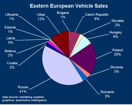 According to a study of KPMG (1997), the potentials in Eastern Europe are still good. The forecast for Eastern European countries varies from more than 100% market growth to less than 20%. Biggest growth market is Hungary, with 74,000 cars sold in 1996 and an expected volume of 143,000 in 2002. The highest volume is currently in Russia with 730,000 cars sold in 1996 and an expectation of more than 1 Mill. in 2002. In 1999 Russia sold about 900,000 cars and 190,000 trucks. Poland is 2nd with 640,000 cars and 61,000 trucks. Czech Republic sold 146,000 cars and Lithuania 164,000. Hungary came up with 129,300 cars in 1999. All others were below 100,000.