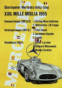 Mercedes SLR 300: Winner of the 1955 Mille Miglia May 1, 1955 – the Mille Miglia: Victory for number 722! The Mercedes team arrived in Brescia for the 1955 Mille Miglia with the aim of sealing an elusive victory. With Karl Kling at the wheel, the 300 SL had already been given a glimpse of victory on its way to a second-place finish three years earlier, but this time the 300 SLR went one better. The W 196 S lined up for the start of the race on May 1, 1955 bristling with endeavor in its first competitive outing. The legendary Mille Miglia took the drivers from Brescia on a high-speed 1597-kilometer loop via Padua, Ferrara and Pescara to Rome, and back through Florence, over the Futa and Raticosa passes to Bologna and Piacenza and over the finish line in Brescia.