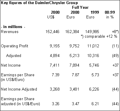Stuttgart/Auburn Hills - Revenues of DaimlerChrysler Group for the full year of 2000 grew by 8 % to 162.4 billion euro, calculated on a comparable basis the increase was 12 %. Operating profit for the full year including one-time effects decreased 11% to 9.8 billion euro while net income increased significantly by 37% to 7.9 billion euro and earnings per share were up from 5.73 euro to 7.87 euro, the company announced after a Board of Management meeting, at which the financial statements for 2000 were approved. But excluding one-time effects totalling 4.6 billion euro operating profit was significantly impacted by second half losses at Chrysler Group and declined by 50% to 5.2 billion euro. Net income was down 44% to 3.5 billion euro (1999: 6.2 billion euro) and earnings per share were lower at 3.45 euro (1999: 6.21 billion) The