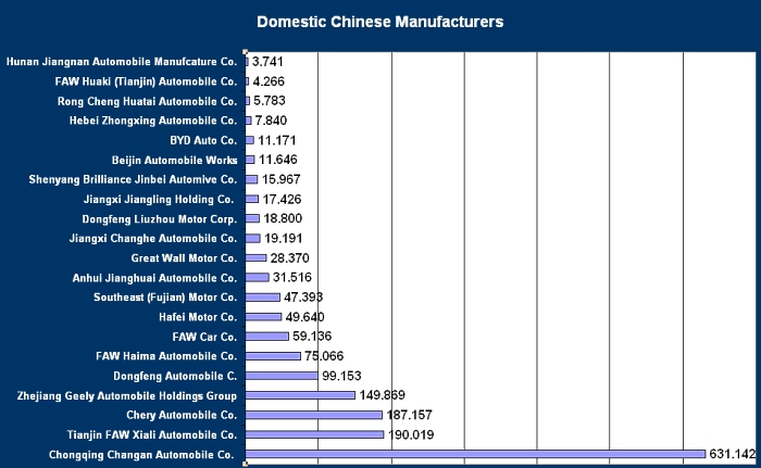 Domestic Chinese Companies Sales in 2005 In China more than 100 companies produce car and trucks. The market of the majority is local, not to say regional. About 20 domestic companies can be regarded as potentially important for the overall Chinese market, as well as for export markets. The biggest domestic auto maker is Chongqing Changan Automobil with more than 630.000 units sold in 2005. Chery is another aggressively growing car maker, who was able to hire some Daewoo engineers and to take advantage of Daewoo's product engineering. In August 2007 Chery announced its plans to export 600.000 units by 2010. "We plan to open 14 new plants overseas and export 600,000 vehicles by 2010," the CEO of Chery, Zhou told Xinhua News Agency at the sidelines of a launching ceremony for the company's one millionth vehicle in August 2007.