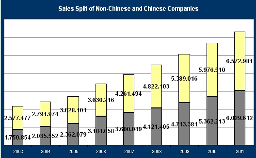 Chinese car market and its automotive industry Foreign car companies and its joint ventures account for about 40% of the market in 2006, but in 2011 the ratio will be almost 1:1 according to figures published by Polk Marketing Systems.