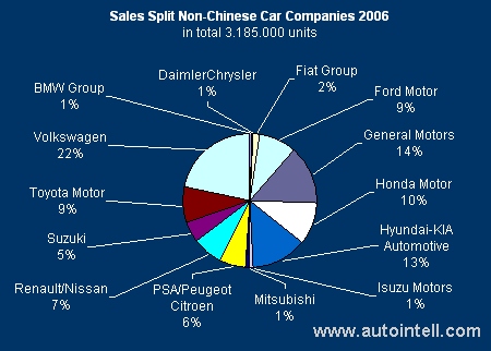 Joint Venture Companies in 2006 In 2006 Volkswagen was the strongest foreign car maker in China. Its early engagement of 1982 paid off. General Motors and Hyundai-Kia established a significant market share. Hyundai recently (August 07) announced its plans to increase car sales to 600.000 units by 2008. Daimler and Chrysler still have a weak footprint in the market, which might change once Chrysler is finding its new identity.
