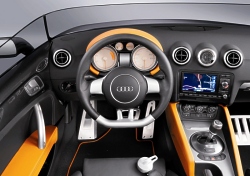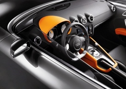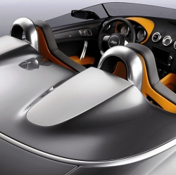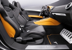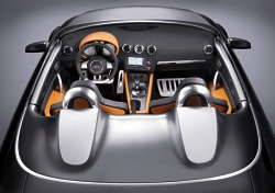 The instrument cluster is very different from the one in a production model. The vertical needles and colour graphics are the eye-catching features. The clock and odometer have been omitted in keeping with the car’s underlying purist philosophy. The racing character of the Audi TT clubsport quattro is underscored by its technology. The Audi engineers have packed the 2.0 TFSI engine with even more power than the 260 bhp familiar from the Audi S3. The turbocharged four-cylinder unit with petrol direct injection breaks the magic 300 bhp barrier. Thanks to a modified intake manifold, it has been possible to get even more power out of this highly efficient engine (which was “Engine of the Year” in its class in 2005 and 2006). Power is transferred to all four wheels, making the TT clubsport quattro the first new-generation TT with four-cylinder engine and quattro permanent four-wheel drive. The transmission is also new in this performance category. Thanks to its dual clutch, the S tronic direct-shift gearbox changes gear virtually without interrupting the flow of power, a process that goes unnoticed by the driver. The six gears can, however, also be changed manually, with gearshifts taking just fractions of a second. Anyone opening the bonnet will be met by a fascinating sight. Thanks to a lack of cables and auxiliaries, the engine compartment looks extremely clean. The engine has deliberately not been hidden under a cover. The cross brace running above the engine is a technical stroke of genius. It not only makes the car more rigid, but also contains the coolant expansion tank. The ABS system has been moved from the engine compartment to the interior. The air conditioning and activated charcoal filter are not to be found in the engine compartment either. A racing air filter ensures that the engine takes in a sufficient amount of air. The exhaust system has been adapted to suit the car’s sporty performance: the specially tuned exhaust emits the genuine sound of motor racing. Ceramic brakes are fitted in the TT for the first time. These are absolutely non-fading and enable countless sharp braking manoeuvres without any loss of stopping power. Once again, Audi has taken advantage of its superior wealth of experience: ceramic brakes are already offered for the RS 4, the A8 and S8, for example, and are enjoying increasing popularity with customers. The Audi TT clubsport quattro is a purist driving machine that combines the performance of a sports car with a unique design language. It consequently remains a TT on the one hand, while at the same time demonstrating just what is possible with such a fascinating production vehicle. The possible small-series production of this model is being considered. May 20, 2007