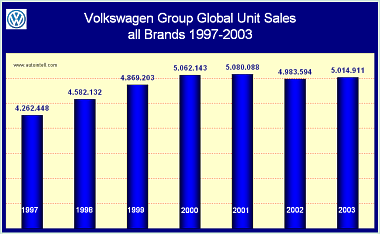 Detroit/Wolfsburg, 10. January 2005 - In 2004, the Volkswagen Group delivered 5.079 million vehicles to customers worldwide. “This is a good sales result given the weak situation on the world’s key automotive markets,” said Dr. Bernd Pischetsrieder, Chairman of the Volkswagen Group Board of Management, on Sunday in Detroit/USA. Pischetsrieder commented that the Group had felt the effects of the headwind on markets in Germany, China and the USA in particular. He did not expect any substantial impulses or dynamic growth from the markets during the current year. Due to high oil prices and continuing aggressive price battles, the situation on the world’s key markets would remain difficult. He reported that the Group would be launching 20 new models in 2005. The Jetta had just debuted in the USA. The new Passat would have its première in Germany in February. The Fox compact car would also be introduced in Europe. With these new models, the Group would maintain its position on world markets in 2005. The increase to 5.079 million vehicles (2003: 5.015 million) represents a rise of 1.3 % compared with the previous year. According to Pischetsrieder, growth was especially noticeable in markets where new models had been launched. The increase in Group sales was particularly strong in the South America/South Africa region, where deliveries to customers rose 25.2% percent to 533,000 units. Developments in Brazil were especially pleasing, with deliveries increasing 14.9 % to 362,000 vehicles. In Europe, deliveries to customers rose 0.8 % to 3.085 million vehicles. In Germany, Group sales rose by 1.2 % to 954,000 units. However, sales declined in North America (572,000; - 9.3 %) and Asia – Pacific (757,000; - 6.3 %). At 3.064 million (2003: 3.075 million), sales by the Volkswagen Passenger Cars brand remained on a par with the previous year. Skoda deliveries to customers increased by 0.4 % to 452,000 vehicles (2003: 449,758). For the first time, Bentley sold substantially more than 6,000 vehicles (2003: 995). Audi again posted record sales, with deliveries totalling 779,000 vehicles (+1,2 %, 2003: 769,900). Deliveries to customers at SEAT declined 3.9 % to 442,000 vehicles (2003: 460,151). Lamborghini increased its sales by 22 % to 1,600 sports cars. Sales by the Volkswagen Commercial Vehicles brand rose by 28.8 % to 333,000 (2003: 258,822). 2003 Deliveries In the financial year 2003 the Volkswagen Group delivered 5,014,911 vehicles worldwide, 0.6% up on the previous year. The fourth quarter saw signs of an increase in sales. In the past year the Volkswagen Group again pursued its strategy of maintaining the value of its products, and consequently was restrained in its use of the sales incentives commonly employed in the industry. The Group’s world market share of new passenger car registrations was 12.1 (12.0)%. 2003 Unit Sales In the year 2003 the worldwide sales of the Volkswagen Group to its dealer organization totalled 5,015,911 units, slightly above the level of the previous year (+ 0.4%). In Germany demand rose slightly towards the end of the year under review, as a result, the previous year’s Group figure was surpassed by 0.8%. Outside Germany, too, Group sales of 4,100,326 units were 0.3% up on the previous year. The proportion of vehicles sold outside Germany remained virtually constant at 81.7 (81.8)%. Increases were achieved in particular by the Chinese joint ventures Shanghai-Volkswagen Automotive Company Ltd. and FAW-Volkswagen Automotive Company Ltd., whose sales rose against the previous year by a substantial 50.4% to 707,307 units. The main driver of unit sales worldwide for the Volkswagen Group was the Passat/Santana, with a 14.4 (14.1)% share of the total. The Golf, despite the model change-over, achieved a 13.3 (16.1)% share, still ahead of the Polo, which represented 9.0 (10.0) % of total unit sales. The unit sales of Volkswagen AG to the dealer organization totalled 1,941,311 vehicles, 5.9% down against the previous year. Of that total, 67.2 (68.9)% were exported from Germany. 2003 Production In the financial year 2003 the Volkswagen Group deployed its flexible production control strategy to adjust its volumes to market conditions. Production totalled 5,020,733 units, 0.1% fewer than in 2002. The new Touran, Touareg and Audi A3 models were well received by the market, resulting in a steady increase in production of them. The production of the joint ventures in China, the market with the fastest sustained growth of all, was increased substantially to 707,619 (470,635) units. 34.7 (35.5) % of total production was made in Germany. An average of 22,043 units (+ 2.6%) per working day were produced Group-wide. The production figure also includes 39,903 Ford Galaxy units, which are also included in unit sales but not in deliveries to customers. Production at the vehicle-producing sites of Volkswagen AG (Emden, Hanover and Wolfsburg) increased by 3.9% to 993,716 units, primarily owing to the high volumes of Touran modules for Auto 5000 GmbH. The average daily production of Volkswagen AG was 4,255 units (– 3.1%). Source: Annual Report 2003