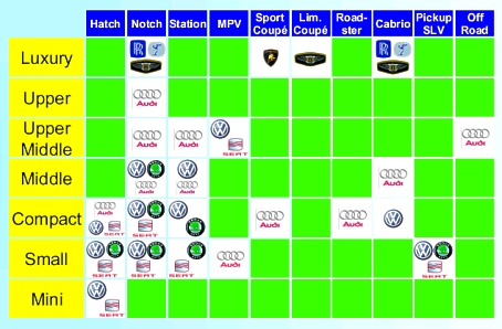 In 2003 Volkswagen introduced a new group structure. The group now consists of the automotive division and the financial services division. Brands are clustered into brand groups. Audi represents the more emotional and sporty part while the Volkswagen brand keeps on tradition.